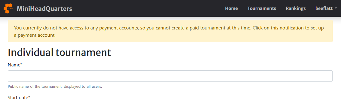 When you create a tournament without a payment account, MHQ warns you with a banner that you will not be able to accept payment on the site until your payment account is set up.