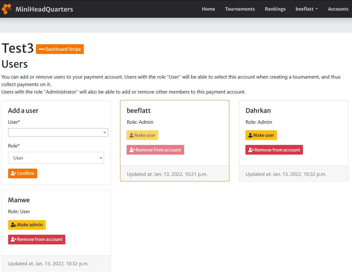 These can be created with "User" or "Administrator" rights. Both can create tournaments using this payment account, but in addition, "Administrators" can add new users themselves.