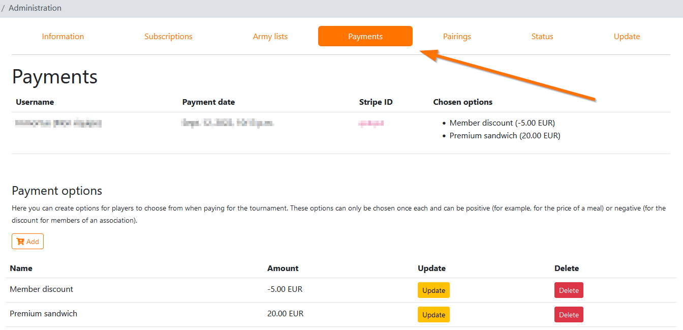 In the administration panel of your tournament, click on Payments tab to access to subscription payment options.