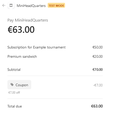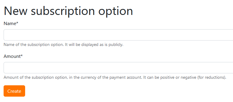 Set the corresponding amount for the option. You can have a positive amount, for a surcharge (eg. a better meal) or a negative amount, for a discount (eg. for an association member). Of course, MiniHeadQuarters does not have the ability to check if user's selection of options is valid (eg. it cannot check if the user is really a member of the association. You'll have to check it yourself).