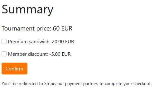 This feature allows you to set registration options that can be selected by users during tournament checkout. This allows you to define for example discounts or surcharges.