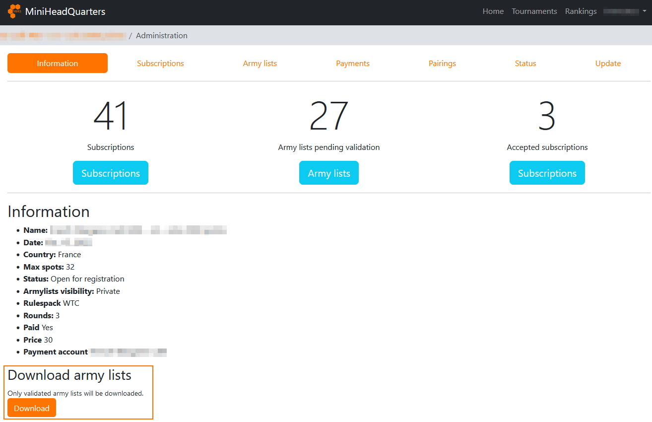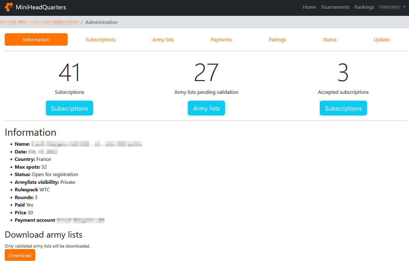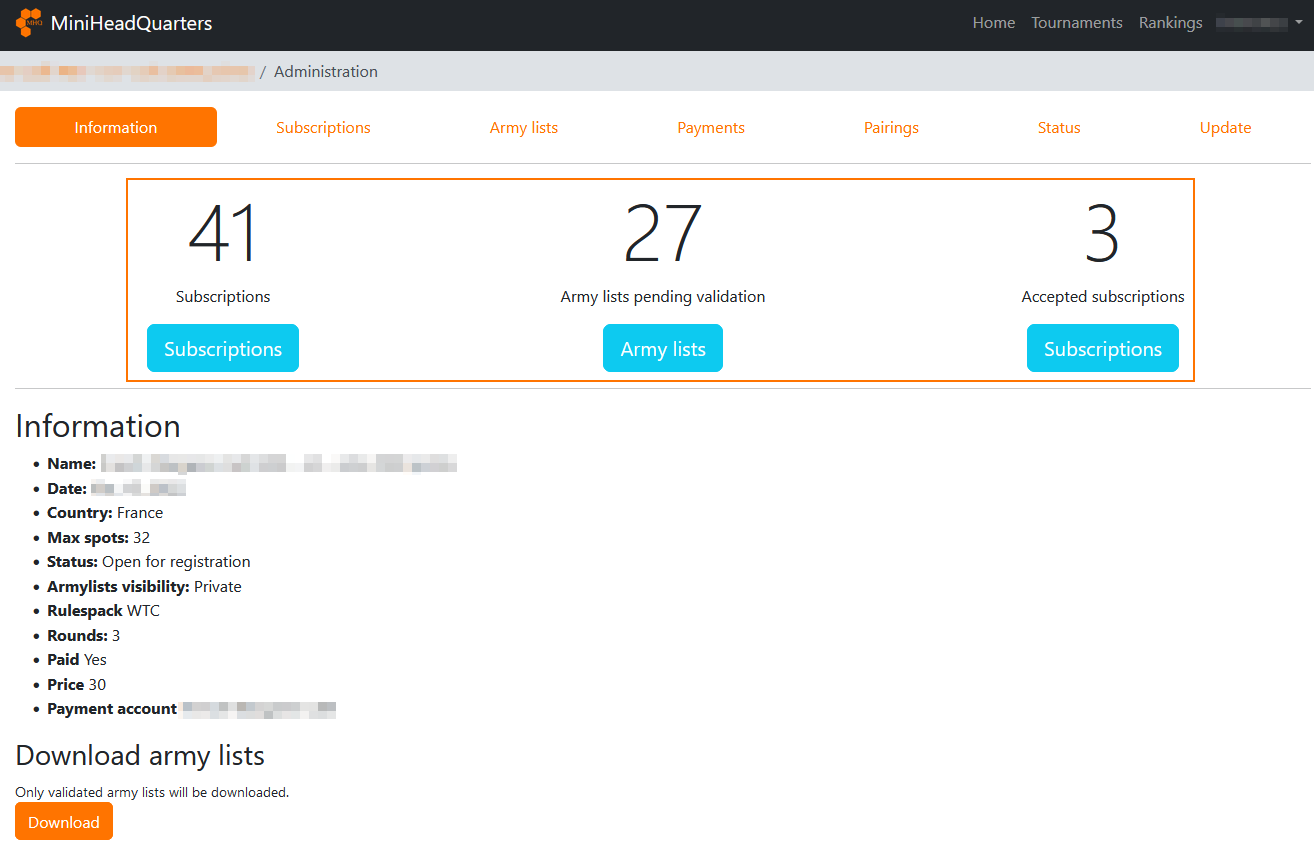 The upper part allows you to quickly see the important information of your tournament: total number of registrations, number of lists awaiting validation, and number of accepted registrations.