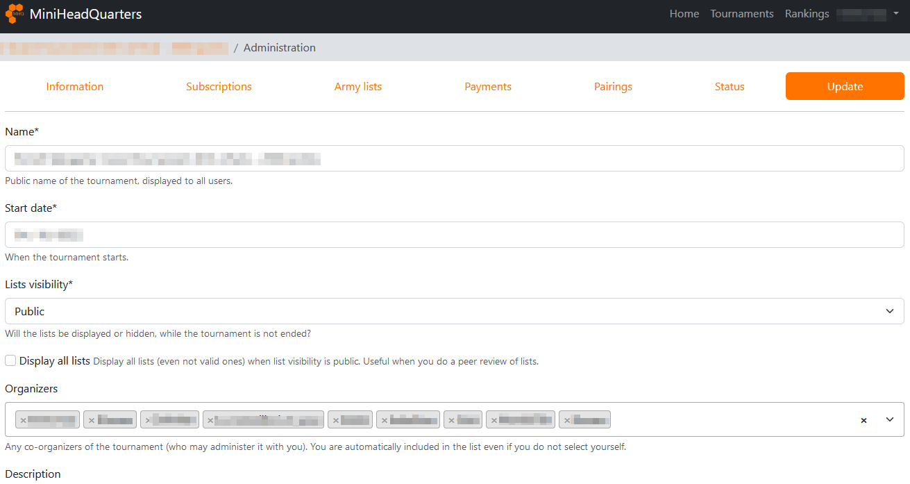 In the Update tab, you can change some information of your tournament.